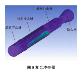 貝克休斯公司2011年推出的牙輪和PDC混合鉆頭(圖8)就是一種沖擊和剪切復合型鉆頭,其將牙輪的旋轉(zhuǎn)沖擊作用與金剛石復合片的剪切作用結(jié)合起來,在軟硬交錯、夾層等不均質(zhì)地層使用,取得了非常好的效果。而近年國內(nèi)推出了復合沖擊器(圖9),在鉆進過程中給鉆頭施加一定頻率的軸向沖擊和扭轉(zhuǎn)沖擊,結(jié)合高抗沖PDC鉆頭,在硬研磨性地層也取得一定成效。